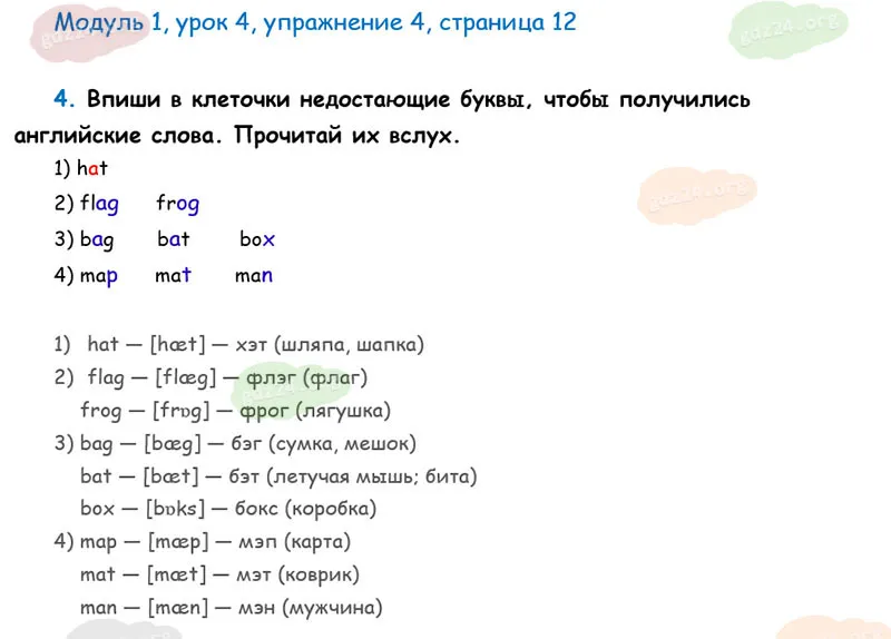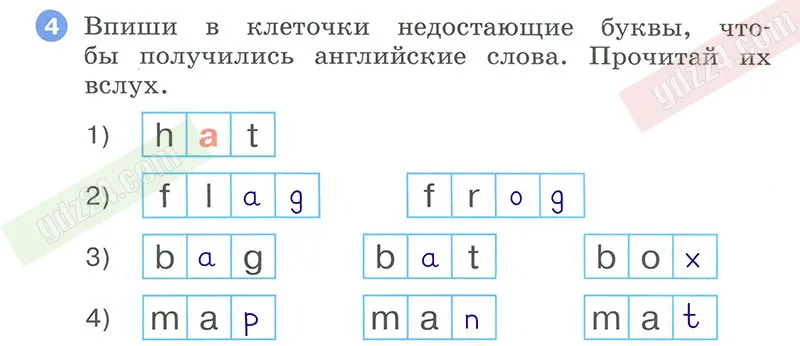 Впиши в клеточки недостающие буквы, чтобы получились английские слова. Прочитай их вслух.