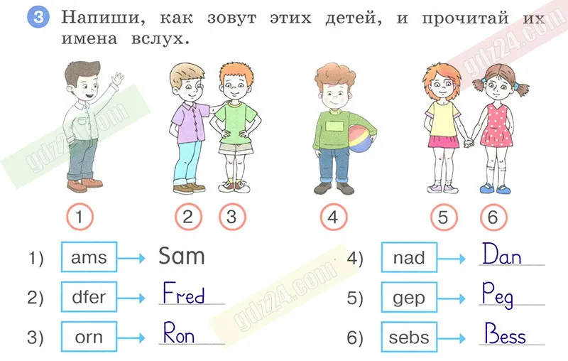 Напиши, как зовут этих детей, и прочитай их имена вслух.