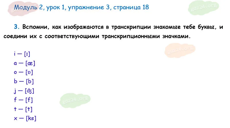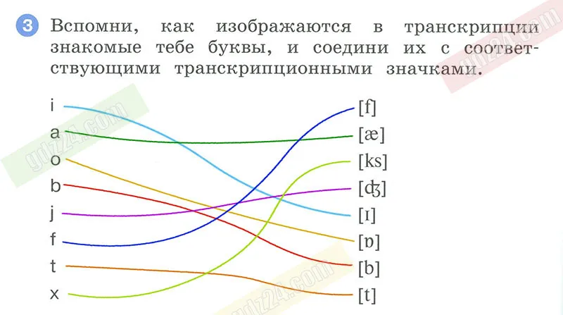 Вспомни, как изображаются в транскрипции знакомые тебе буквы, и соедини их с соответствующими транскрипционными значками.