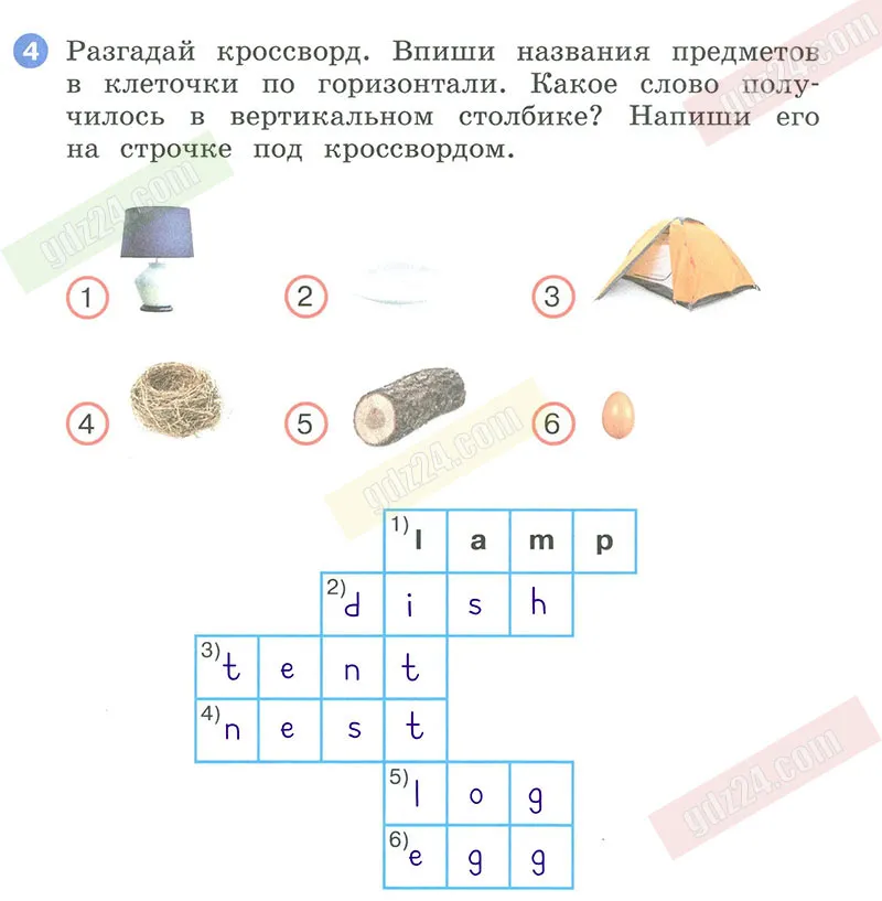 Разгадай кроссворд. Впиши названия предметов в клеточки по горизонтали. Какое слово получилось в вертикальном столбике? Напиши его на строчке под кроссвордом.