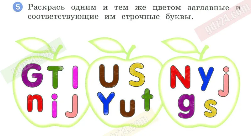 Раскрась одним и тем же цветом заглавные и соответствующие им строчные буквы.