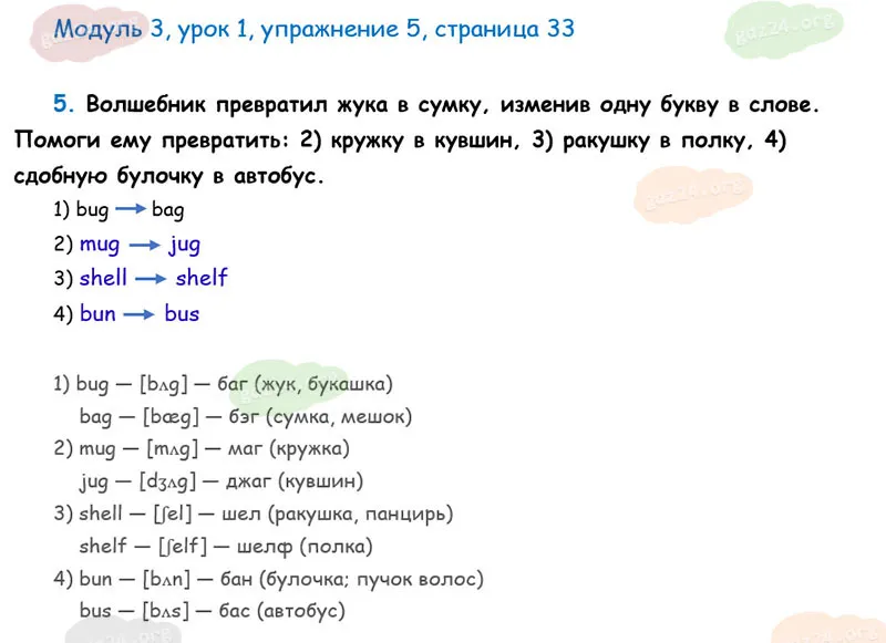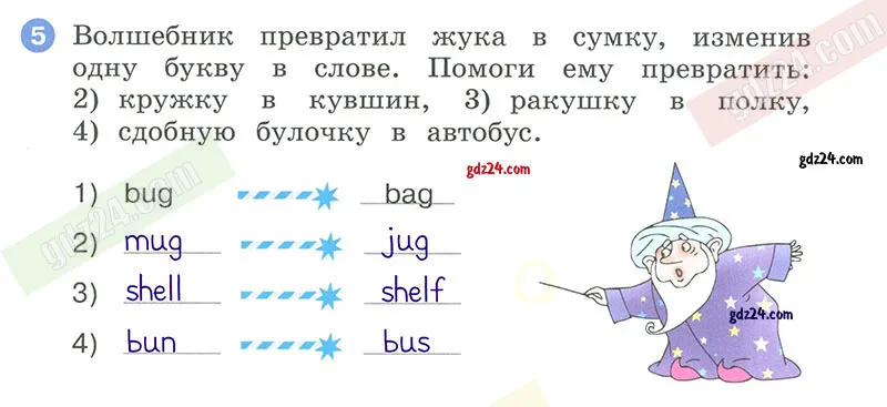 Волшебник превратил жука в сумку, изменив одну букву в слове. Помоги ему превратить: 2) кружку в кувшин, 3) ракушку в полку, 4) сдобную булочку в автобус.