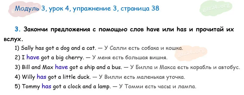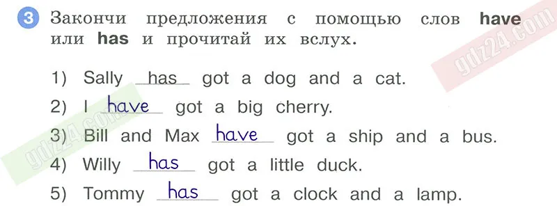 Закончи предложения с помощью слов have или has и прочитай их вслух.