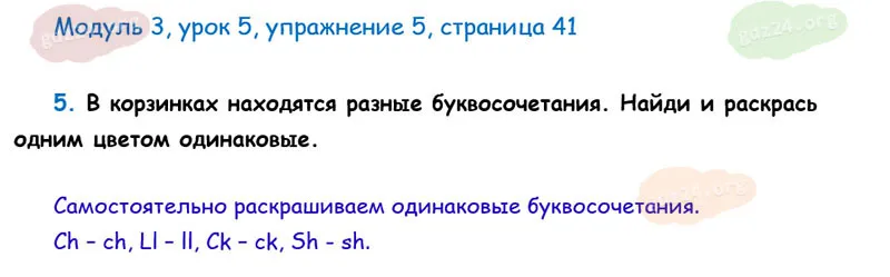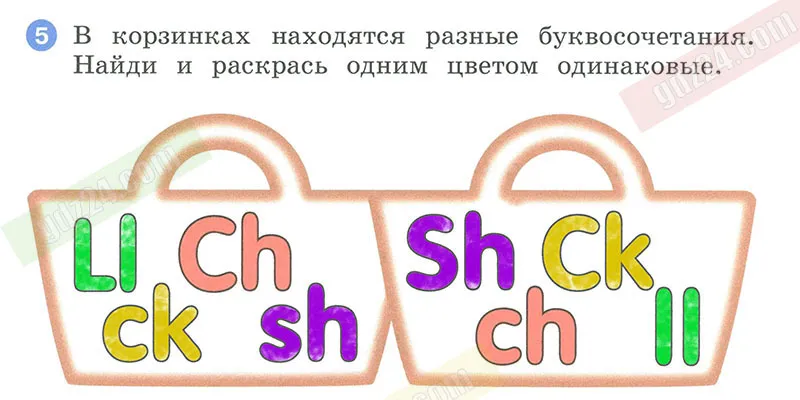 В корзинках находятся разные буквосочетания. Найди и раскрась одним цветом одинаковые.