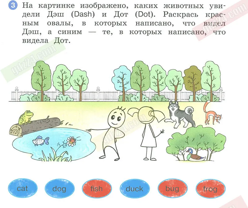 На картинке изображено, каких животных увидели Дэш (Dash) и Дот (Dot). Раскрась красным овалы, в которых написано, что видел Дэш, а синим − те, в которых написано, что видела Дот.