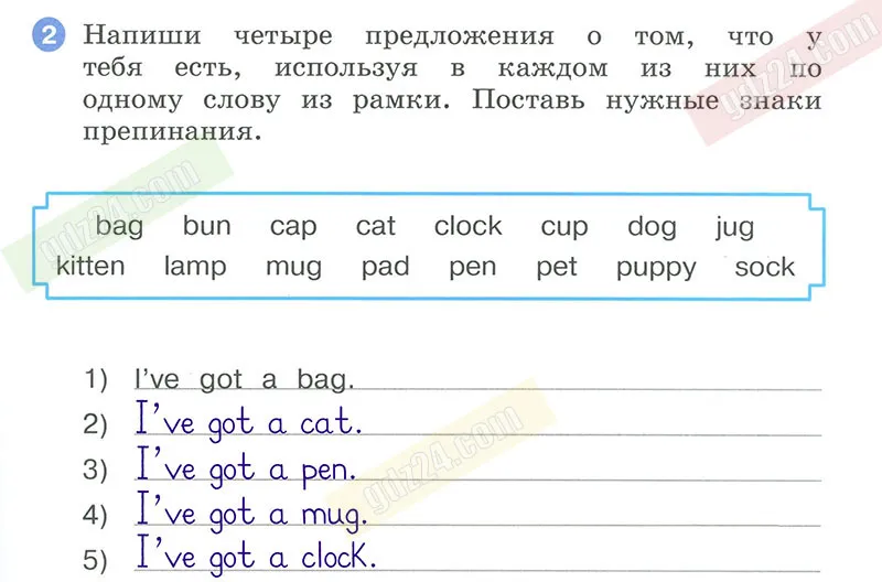 Напиши четыре предложения о том, что у тебя есть, используя в каждом из них по одному слову из рамки. Поставь нужные знаки препинания.