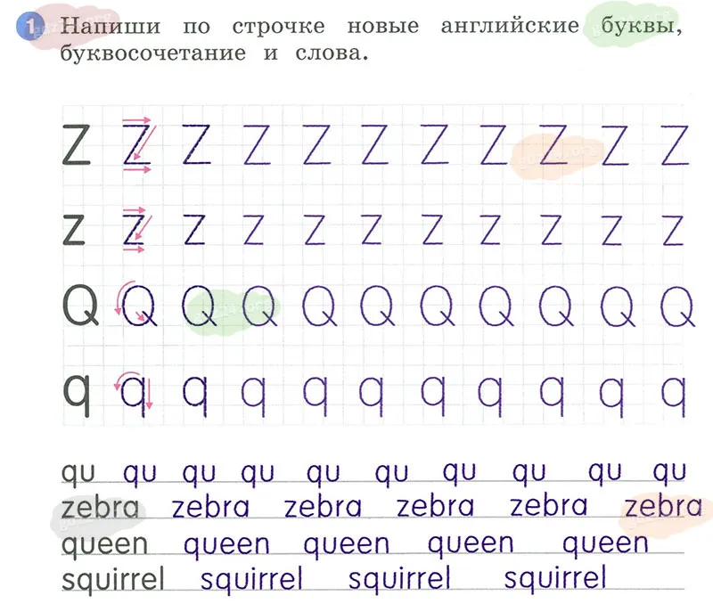 Напиши по строчке новые английские буквы, буквосочетание и слова.