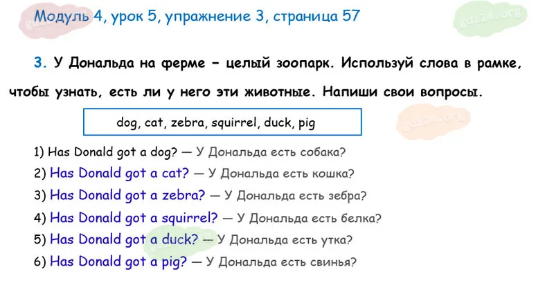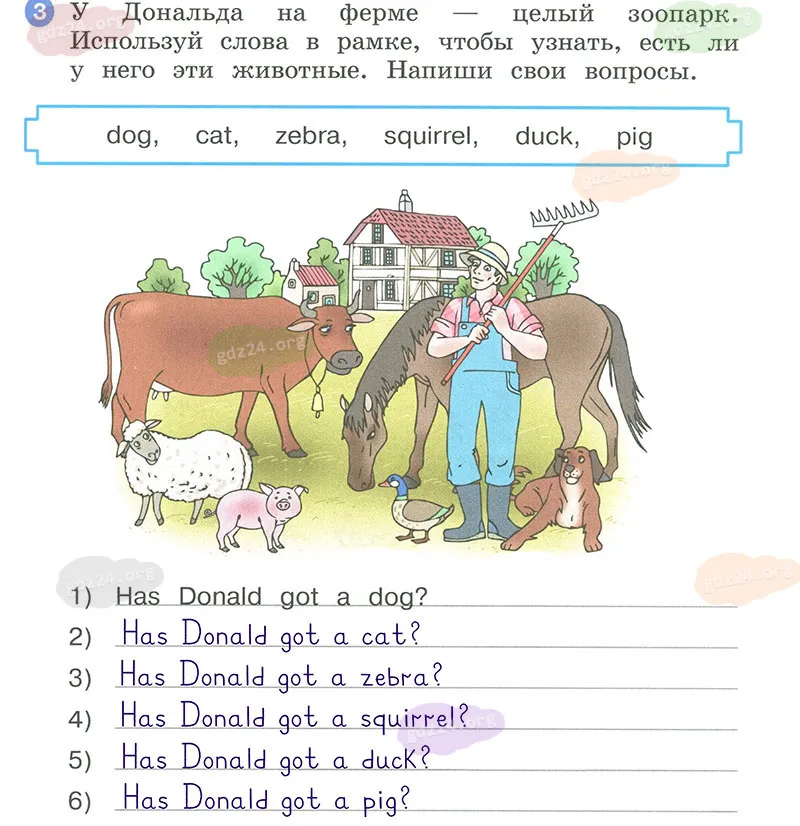У Дональда на ферме − целый зоопарк. Используй слова в рамке, чтобы узнать, есть ли у него эти животные. Напиши свои вопросы.