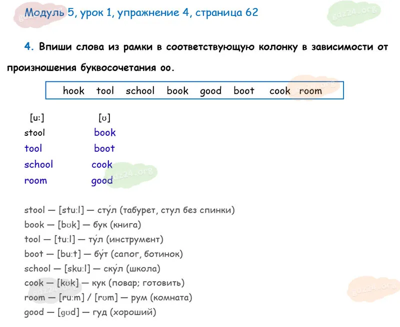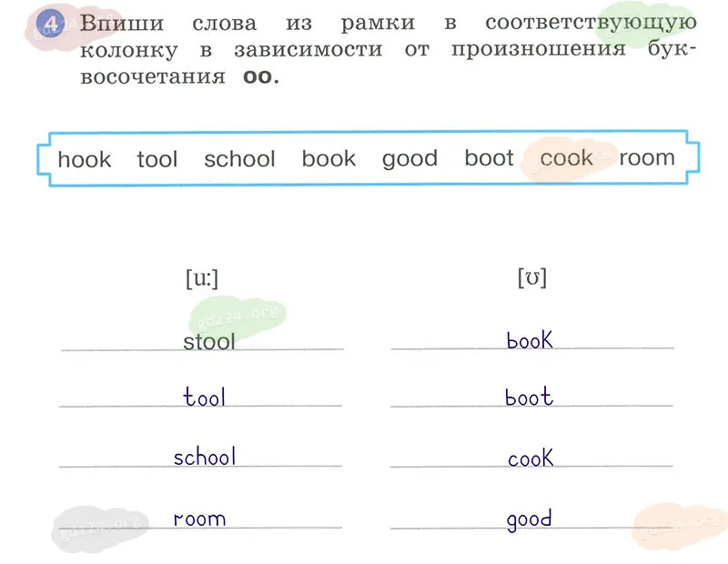 Впиши слова из рамки в соответствующую колонку в зависимости от произношения буквосочетания oo.