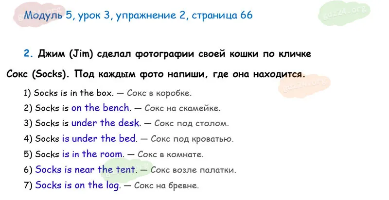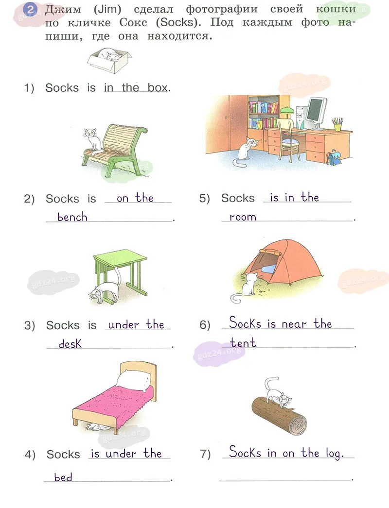 Джим (Jim) сделал фотографии своей кошки по кличке Сокс (Socks). Под каждым фото напиши, где она находится.