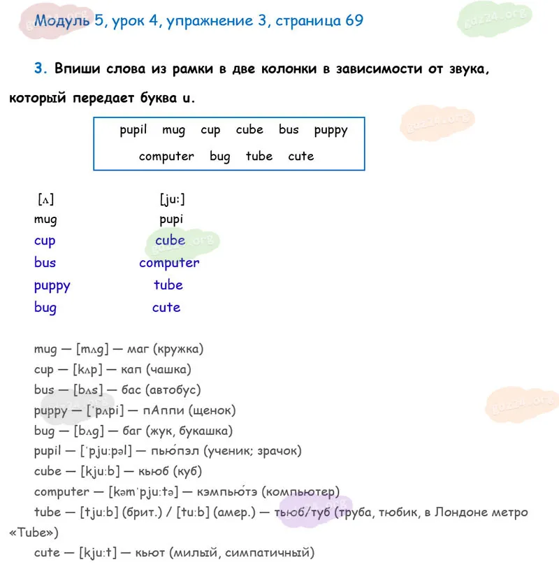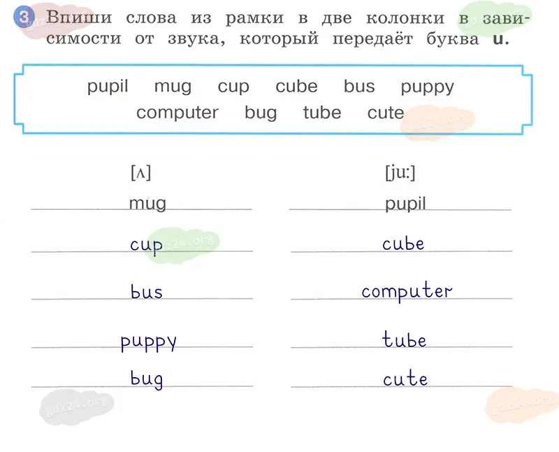 Впиши слова из рамки в две колонки в зависимости от звука, который передает буква u.