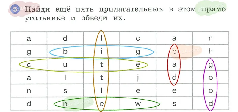 Найди еще пять прилагательных в этом прямоугольнике и обведи их.