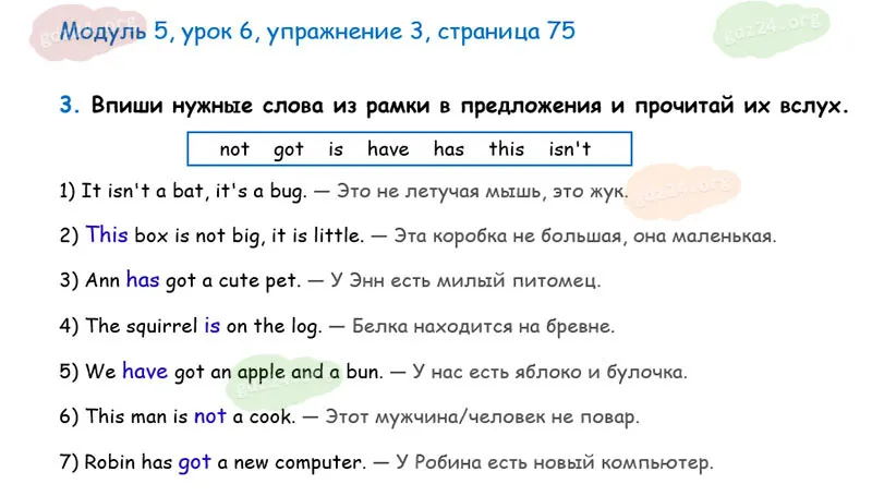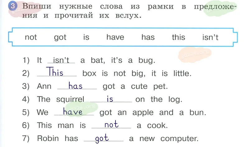 Впиши нужные слова из рамки в предложения и прочитай их вслух.