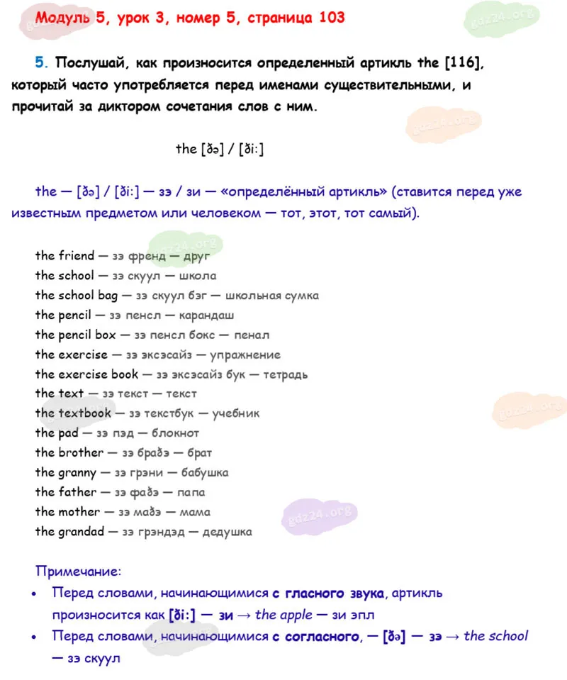 Подробные ответы к 5 заданию на 103 странице учебника О. В. Афанасьевой, К. М. Барановой, И. В. Михеевой 2025 года ФГОС, 2 класс 1 часть. Модуль 5. Вот моя школа и мои друзья.