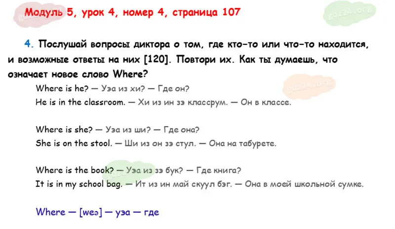 Подробные ответы к 4 заданию на 107 странице учебника О. В. Афанасьевой, К. М. Барановой, И. В. Михеевой 2025 года ФГОС, 2 класс 1 часть. Модуль 5. Вот моя школа и мои друзья.