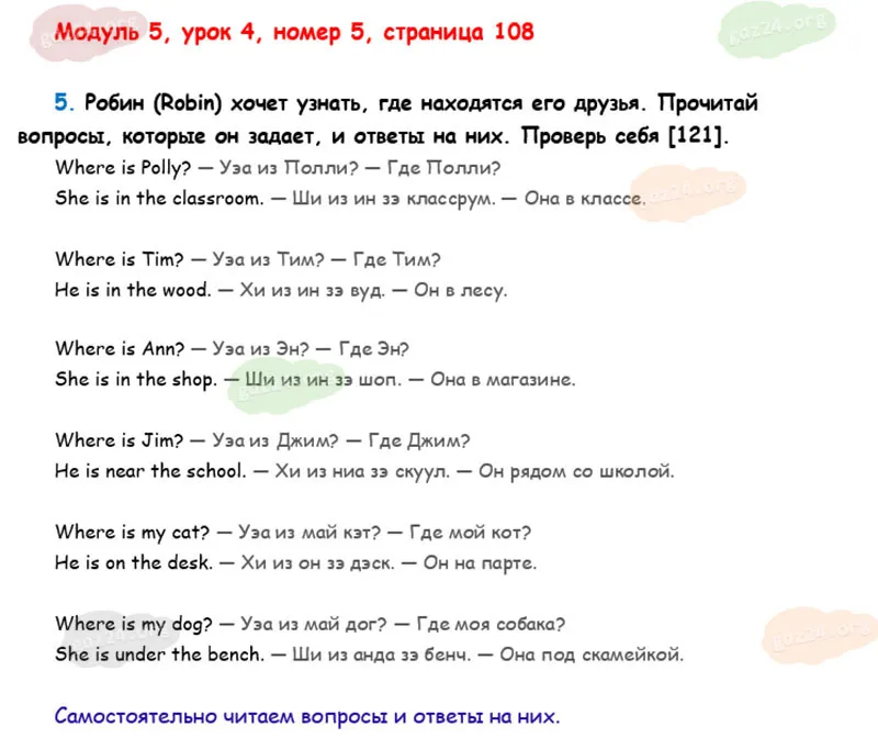 Подробные ответы к 5 заданию на 108 странице учебника О. В. Афанасьевой, К. М. Барановой, И. В. Михеевой 2025 года ФГОС, 2 класс 1 часть. Модуль 5. Вот моя школа и мои друзья.