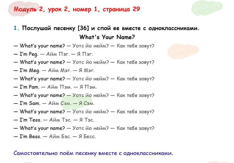 Подробные ответы к 1 заданию на 29 странице учебника О. В. Афанасьевой, К. М. Барановой, И. В. Михеевой 2025 года ФГОС, 2 класс 1 часть. Модуль 2. Продолжаем знакомиться.