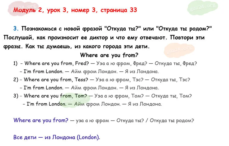 Подробные ответы к 3 заданию на 33 странице учебника О. В. Афанасьевой, К. М. Барановой, И. В. Михеевой 2025 года ФГОС, 2 класс 1 часть. Модуль 2. Продолжаем знакомиться.