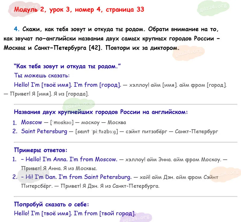 Подробные ответы к 4 заданию на 33 странице учебника О. В. Афанасьевой, К. М. Барановой, И. В. Михеевой 2025 года ФГОС, 2 класс 1 часть. Модуль 2. Продолжаем знакомиться.