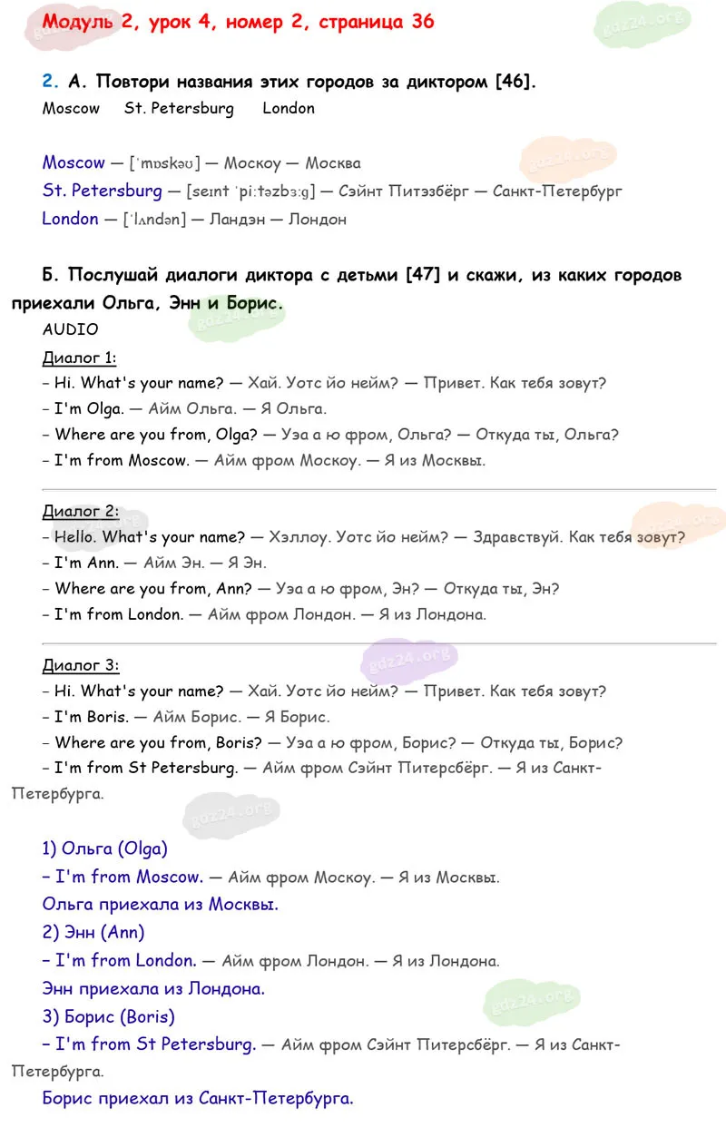 Подробные ответы к 2 заданию на 36 странице учебника О. В. Афанасьевой, К. М. Барановой, И. В. Михеевой 2025 года ФГОС, 2 класс 1 часть. Модуль 2. Продолжаем знакомиться.