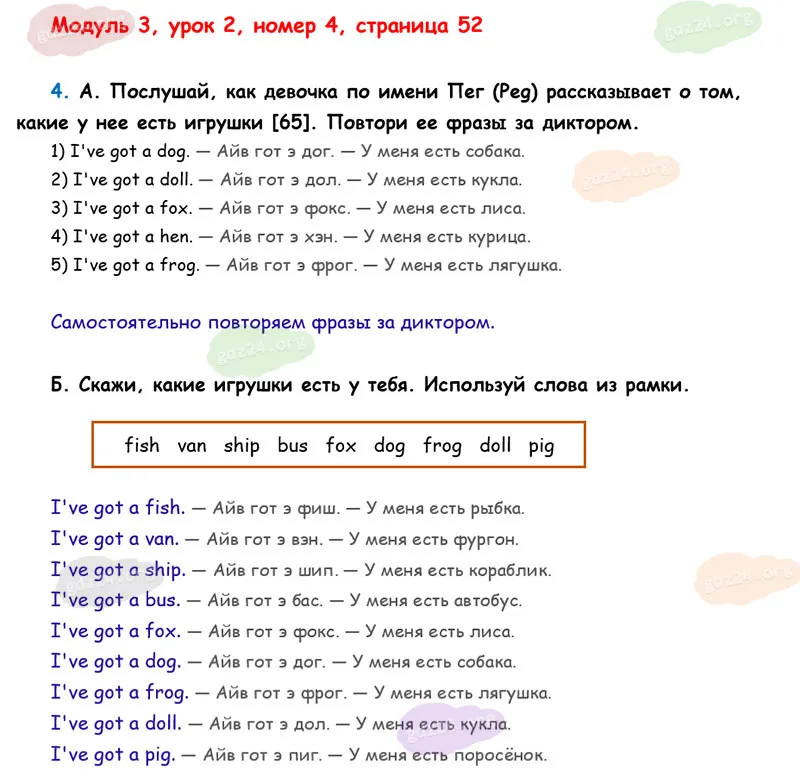 Подробные ответы к 4 заданию на 52 странице учебника О. В. Афанасьевой, К. М. Барановой, И. В. Михеевой 2025 года ФГОС, 2 класс 1 часть. Модуль 3. Вот мои игрушки и питомцы.