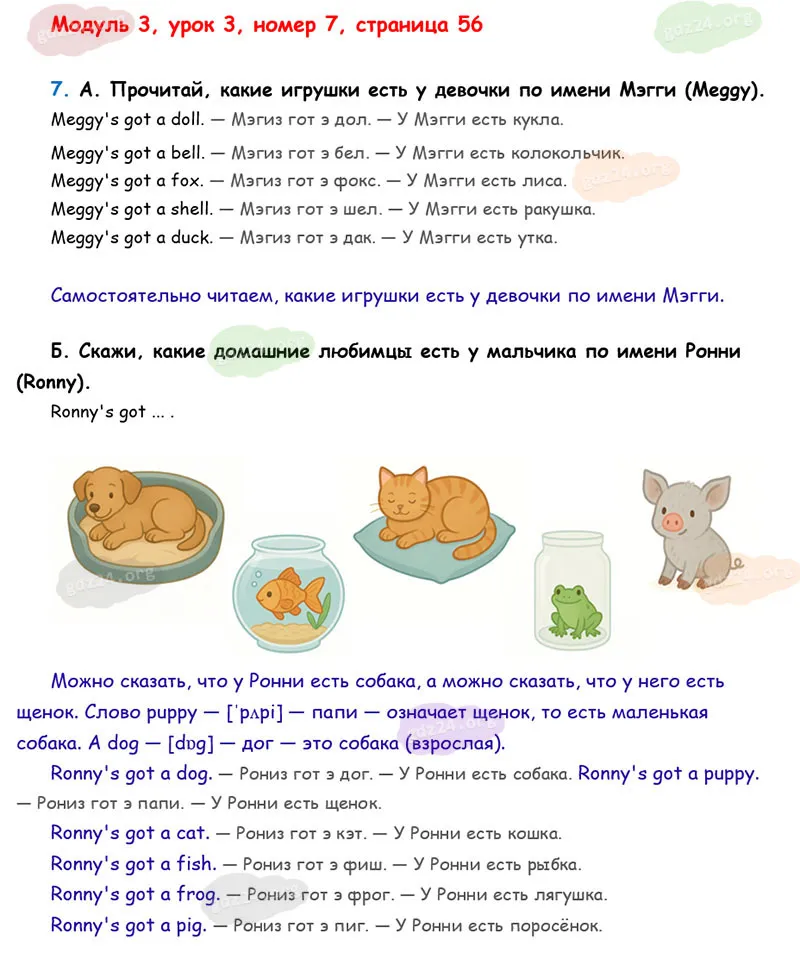 Подробные ответы к 7 заданию на 56 странице учебника О. В. Афанасьевой, К. М. Барановой, И. В. Михеевой 2025 года ФГОС, 2 класс 1 часть. Модуль 3. Вот мои игрушки и питомцы.