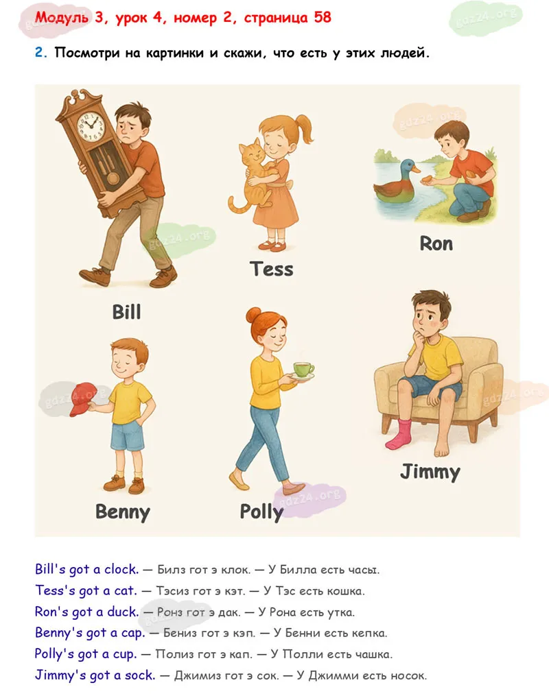 Подробные ответы к 2 заданию на 58 странице учебника О. В. Афанасьевой, К. М. Барановой, И. В. Михеевой 2025 года ФГОС, 2 класс 1 часть. Модуль 3. Вот мои игрушки и питомцы.