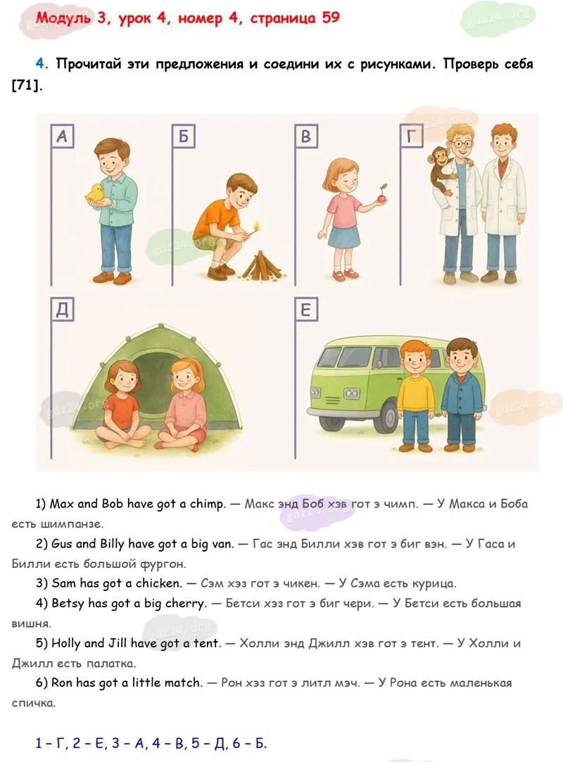 Подробные ответы к 4 заданию на 59 странице учебника О. В. Афанасьевой, К. М. Барановой, И. В. Михеевой 2025 года ФГОС, 2 класс 1 часть. Модуль 3. Вот мои игрушки и питомцы.