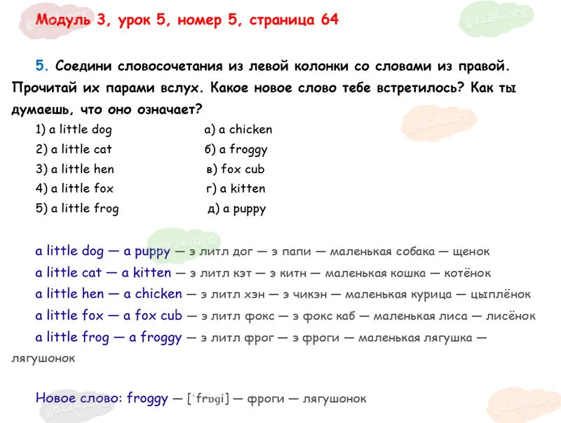 Подробные ответы к 5 заданию на 64 странице учебника О. В. Афанасьевой, К. М. Барановой, И. В. Михеевой 2025 года ФГОС, 2 класс 1 часть. Модуль 3. Вот мои игрушки и питомцы.