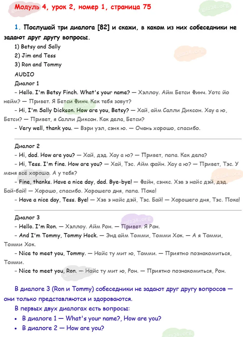 Подробные ответы к 1 заданию на 75 странице учебника О. В. Афанасьевой, К. М. Барановой, И. В. Михеевой 2025 года ФГОС, 2 класс 1 часть. Модуль 4. Вот моя семья.