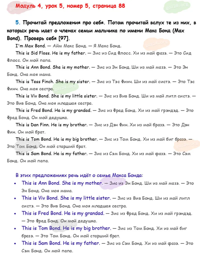 Подробные ответы к 5 заданию на 88 странице учебника О. В. Афанасьевой, К. М. Барановой, И. В. Михеевой 2025 года ФГОС, 2 класс 1 часть. Модуль 4. Вот моя семья.