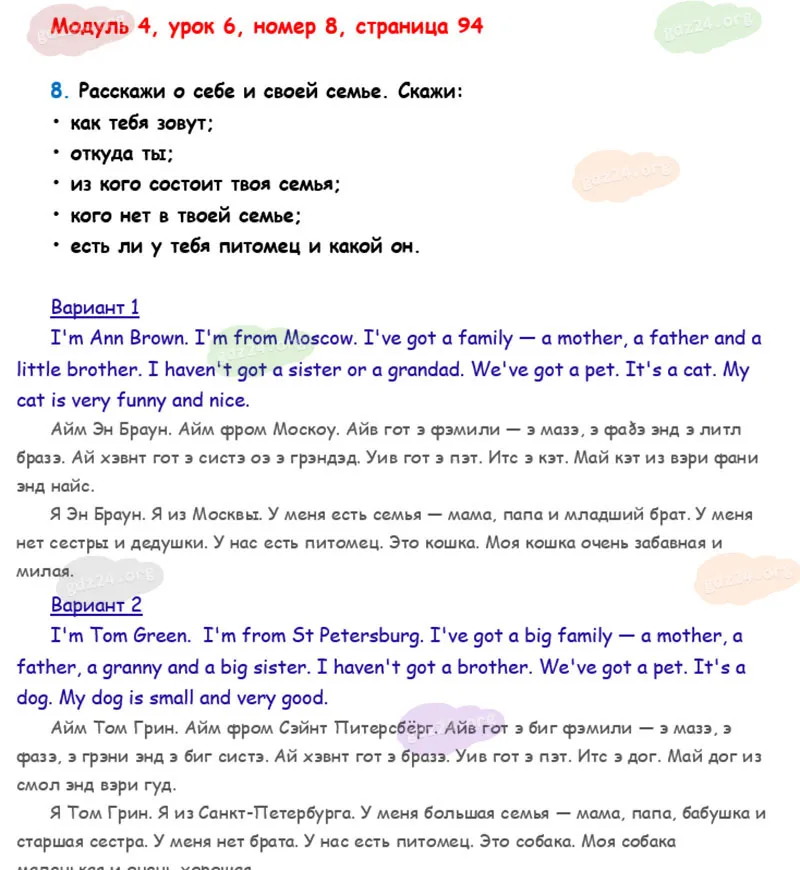 Подробные ответы к 8 заданию на 94 странице учебника О. В. Афанасьевой, К. М. Барановой, И. В. Михеевой 2025 года ФГОС, 2 класс 1 часть. Модуль 4. Вот моя семья.