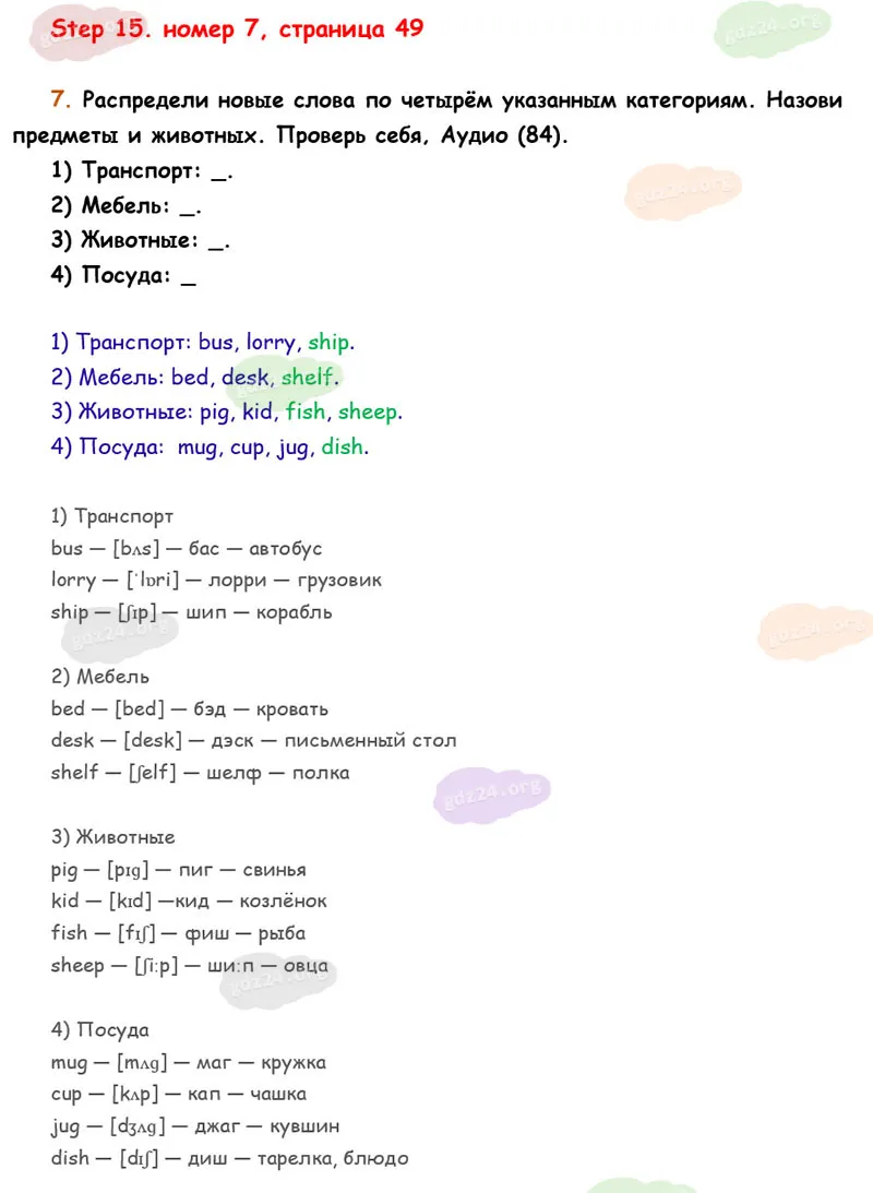 Подробные ответы к 7 заданию на 49 странице учебника Rainbow English. О. В. Афанасьева, И. В. Михеева 2026 года ФГОС, 2 класс 1 часть. Step 15.