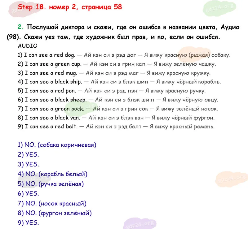 Подробные ответы к 2 заданию на 58 странице учебника Rainbow English. О. В. Афанасьева, И. В. Михеева 2026 года ФГОС, 2 класс 1 часть. Step 18.