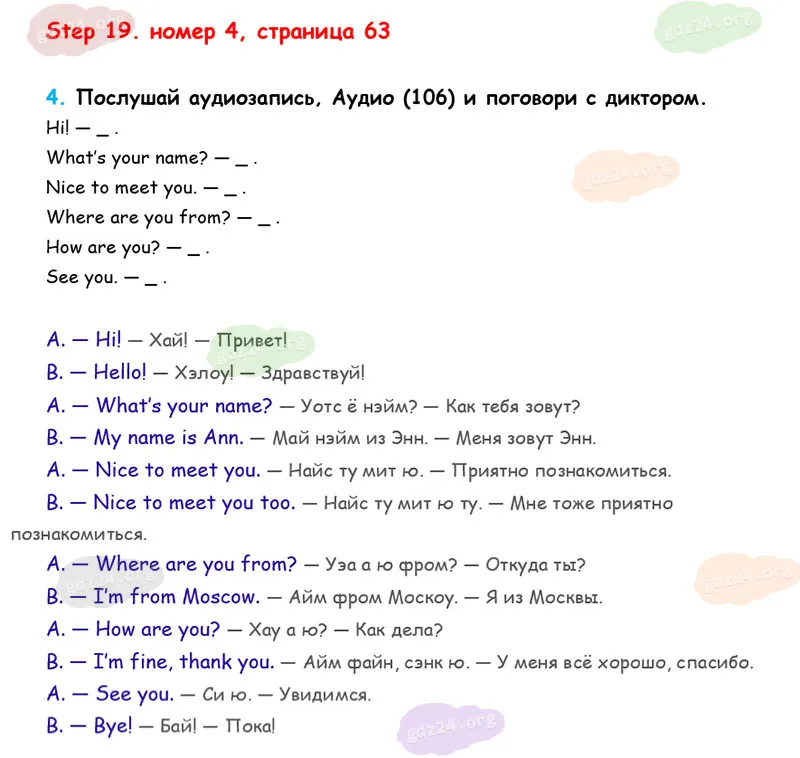 Подробные ответы к 4 заданию на 63 странице учебника Rainbow English. О. В. Афанасьева, И. В. Михеева 2026 года ФГОС, 2 класс 1 часть. Step 19.