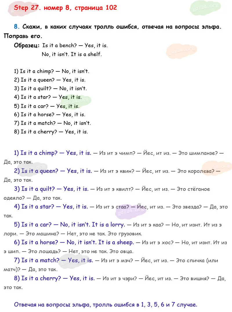 Подробные ответы к 8 заданию на 102 странице учебника Rainbow English. О. В. Афанасьева, И. В. Михеева 2026 года ФГОС, 2 класс 1 часть. Step 27.