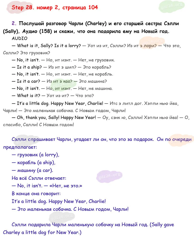 Подробные ответы к 2 заданию на 104 странице учебника Rainbow English. О. В. Афанасьева, И. В. Михеева 2026 года ФГОС, 2 класс 1 часть. Step 28.
