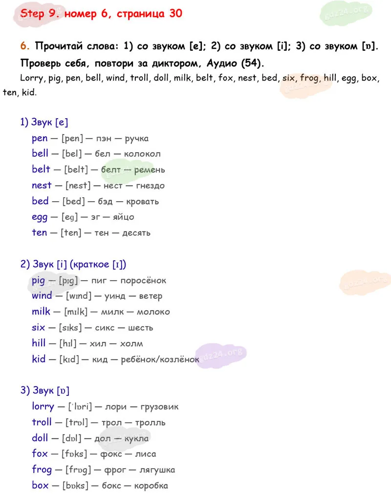 Подробные ответы к 6 заданию на 30 странице учебника Rainbow English. О. В. Афанасьева, И. В. Михеева 2026 года ФГОС, 2 класс 1 часть. Step 9.