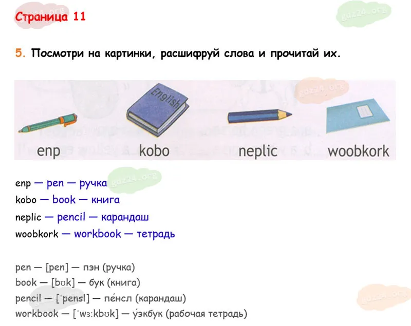 Посмотри на картинки, расшифруй слова и прочитай их.