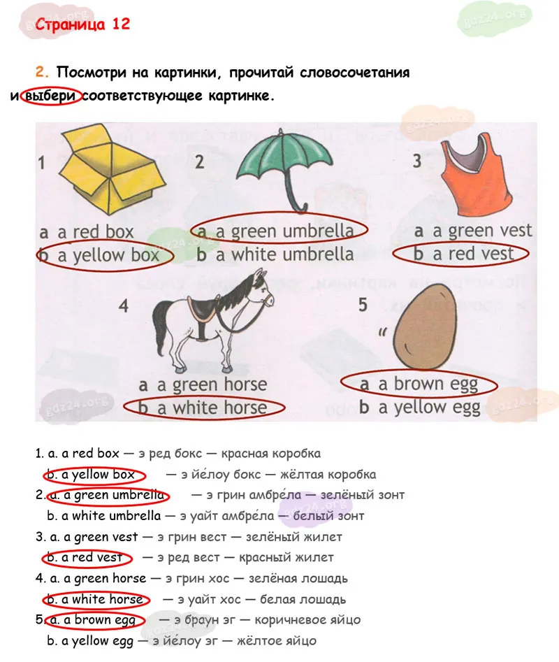 Посмотри на картинки, прочитай словосочетания и выбери соответствующее картинке.