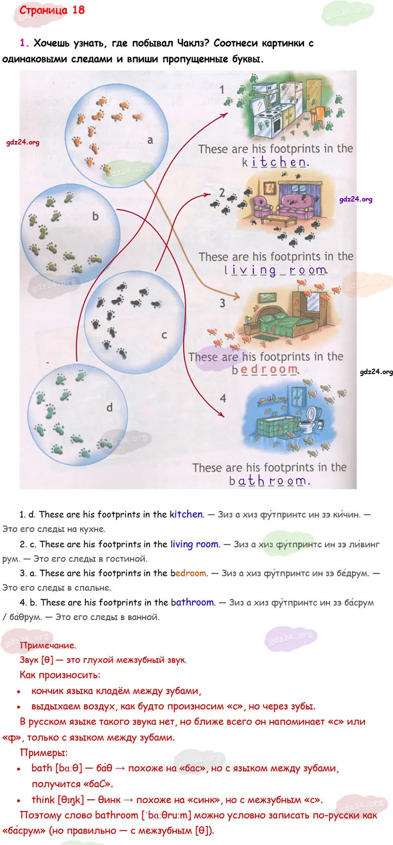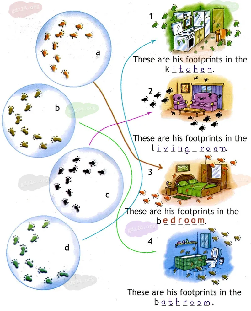Хочешь узнать, где побывал Чаклз? Соотнеси картинки с одинаковыми следами и впиши пропущенные буквы.