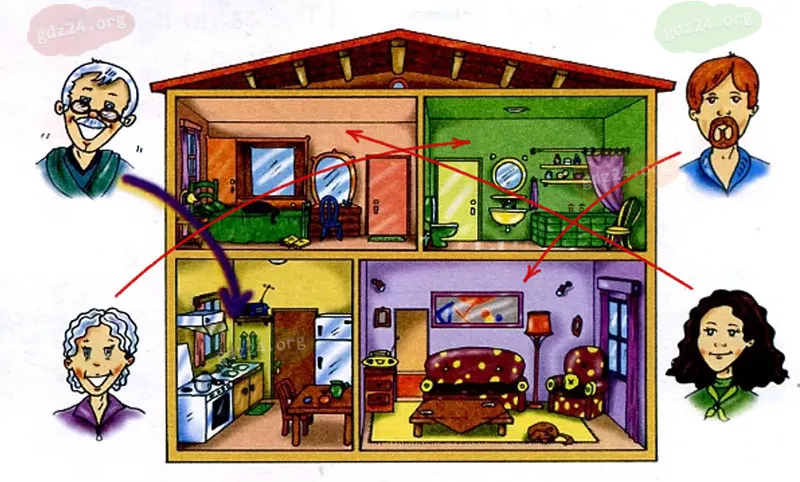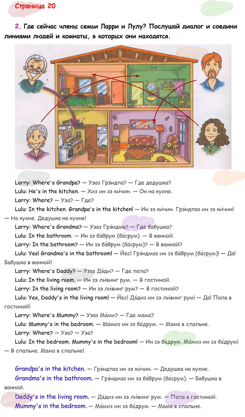 Где сейчас члены семьи Ларри и Лулу? Послушай диалог и соедини линиями людей и комнаты, в которых они находятся.