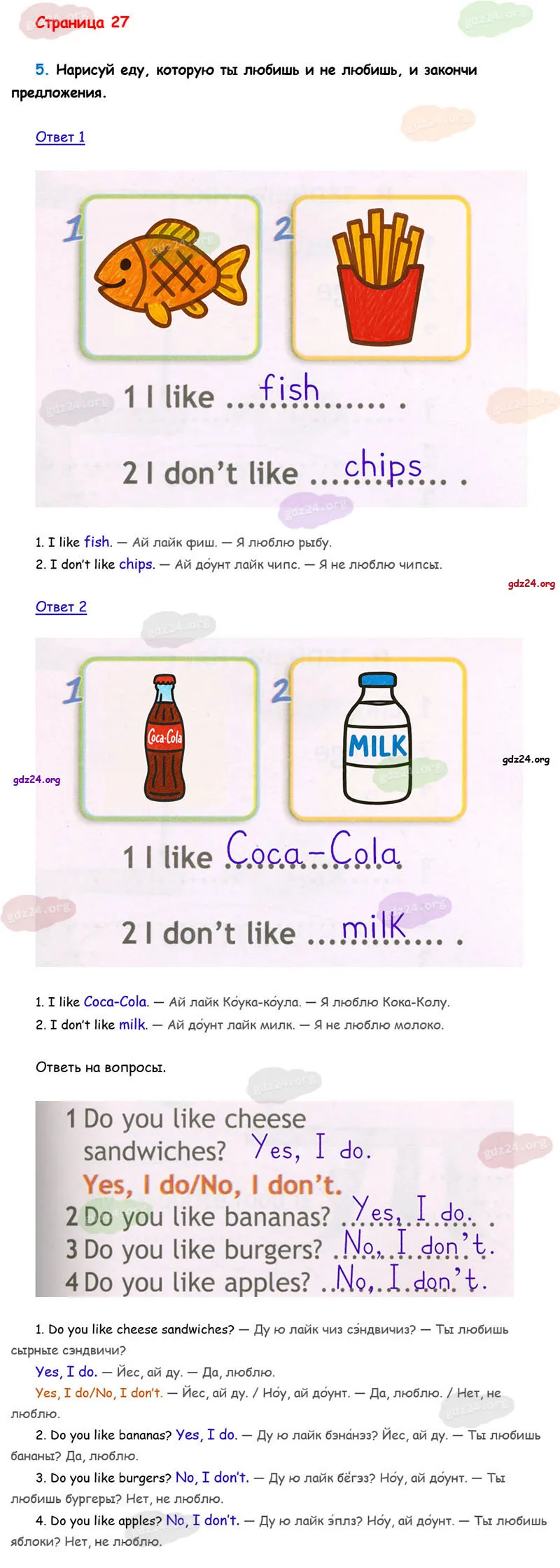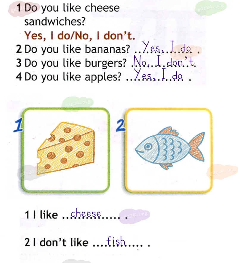 Ответь на вопросы. Нарисуй еду, которую ты любишь и не любишь, и закончи предложения.
