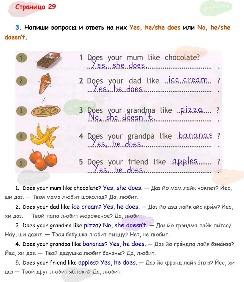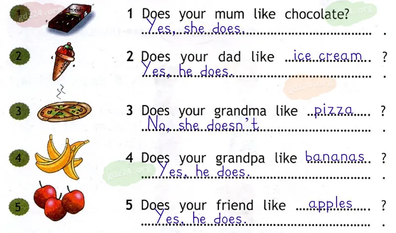 Напиши вопросы и ответь на них Yes, he/she does или No, he/she doesn’t.