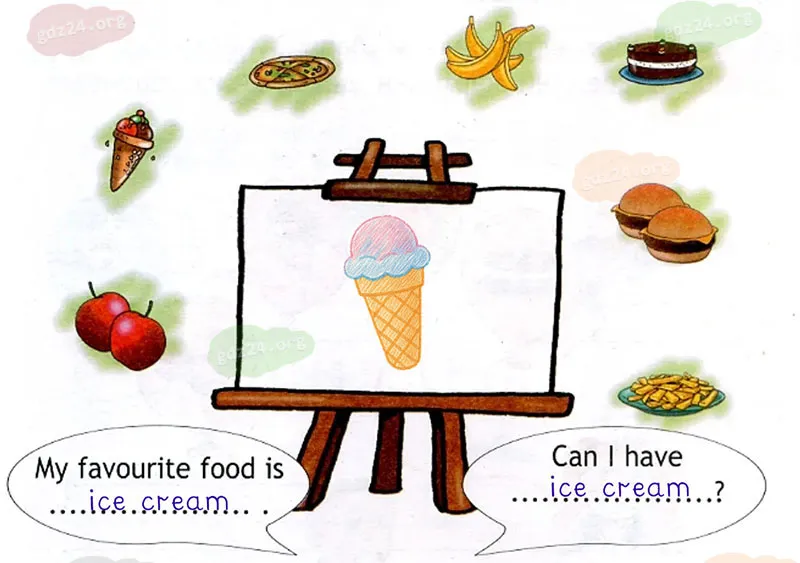 Посмотри на картинки, выбери и нарисуй свою любимую еду и закончи предложения.