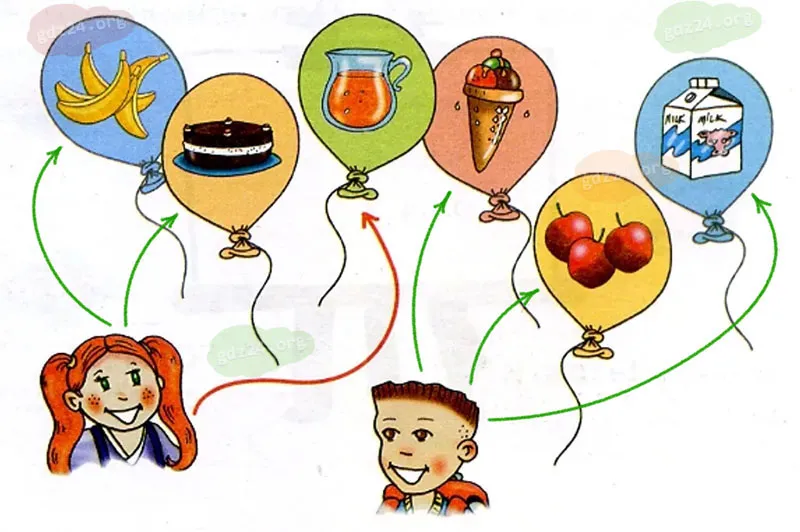 Что любят есть Лулу и Ларри? Послушай диалог и соедини картинки детей и их любимые продукты.