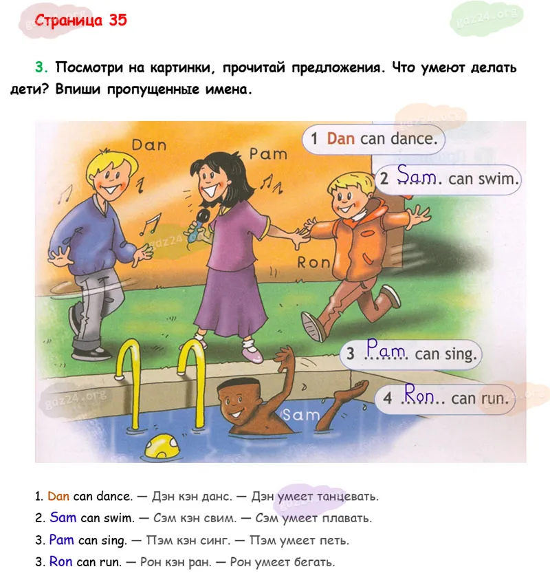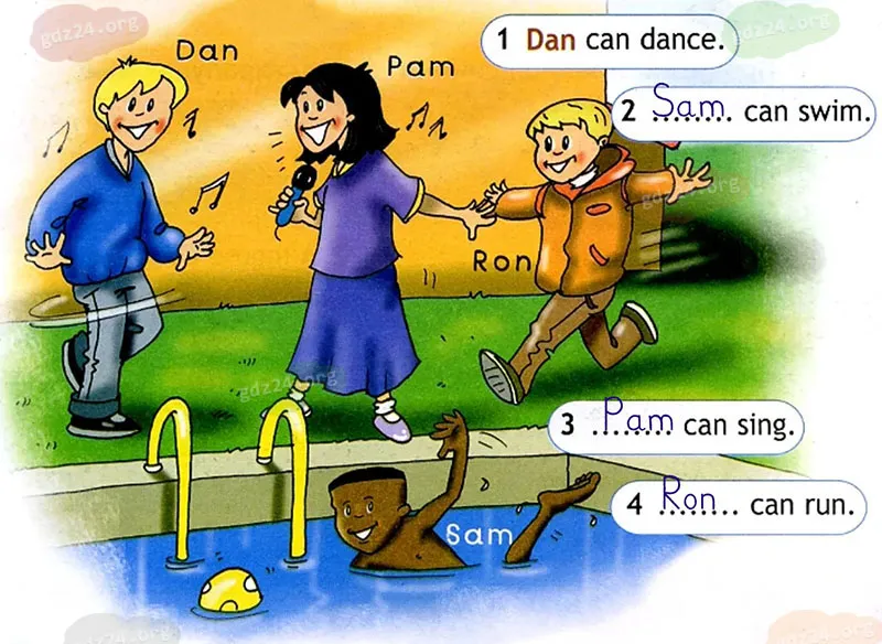 Посмотри на картинки, прочитай предложения. Что умеют делать дети? Впиши пропущенные имена.