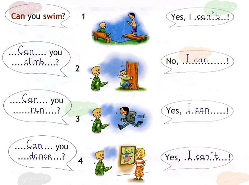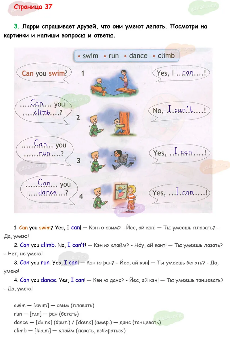 Ларри спрашивает друзей, что они умеют делать. Посмотри на картинки и напиши вопросы и ответы.