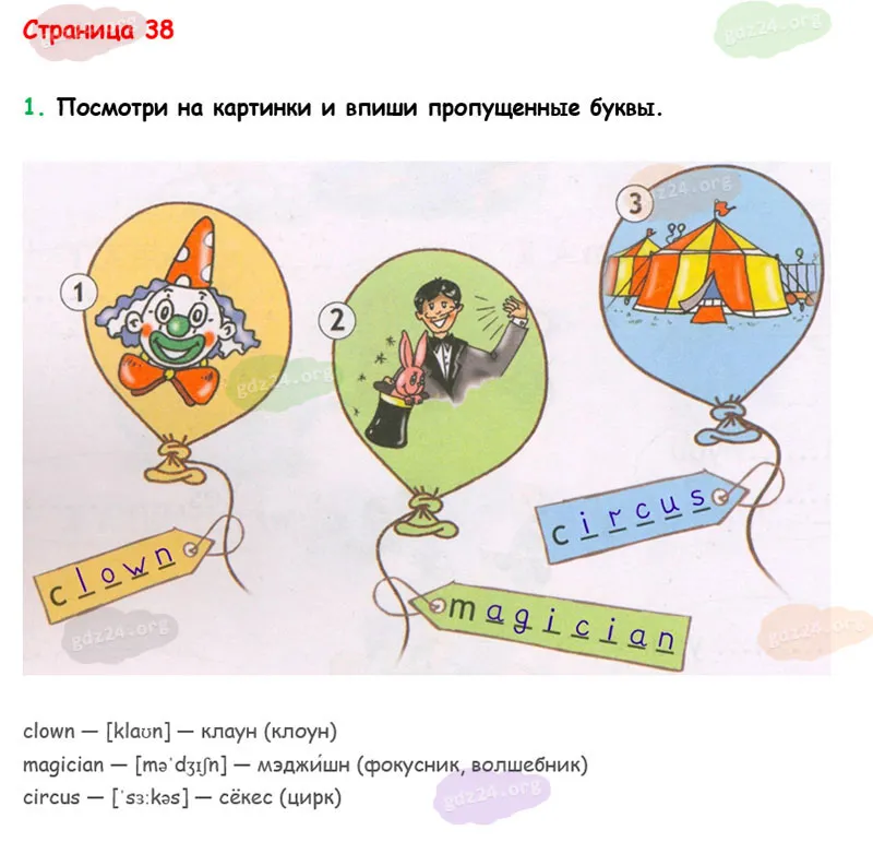 Подробные ответы к 1 заданию на 38 странице рабочей тетради Spotlight. Английский в фокусе. Н. И. Быкова, Д. Дули, М. Д. Поспелова и др. 2025 года ФГОС, 2 класс. 9. At the Circus!