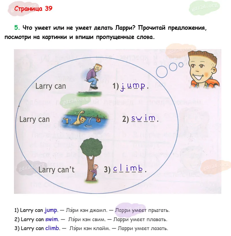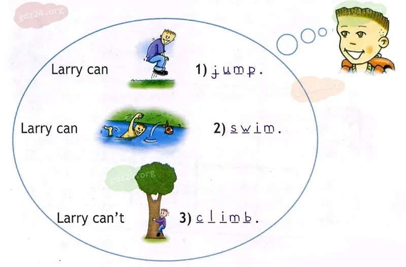 Что умеет или не умеет делать Ларри? Прочитай предложения, посмотри на картинки и впиши пропущенные слова.